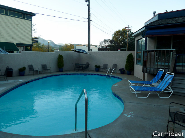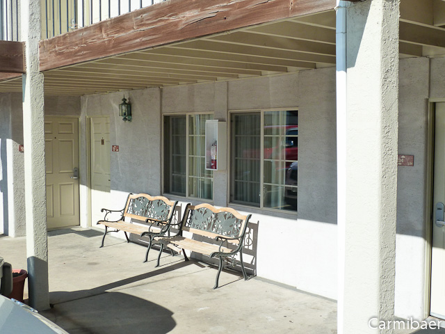 Das Motel besteht aus zwei ebenerdigen Gebäudeteilen. In der Mitte ist der Pool und die Parkplätze sind vor den Zimmern bzw. rund um den Pool angeordnet. Da wir in einem der hinteren Zimmer sind, haben wir nicht viel von der viel befahrenen Strasse mitbekommen. Das Motel liegt an einer Strasse, die schon bessere Zeiten gesehen hat bzw. es sind viele Läden älter oder leer stehend.