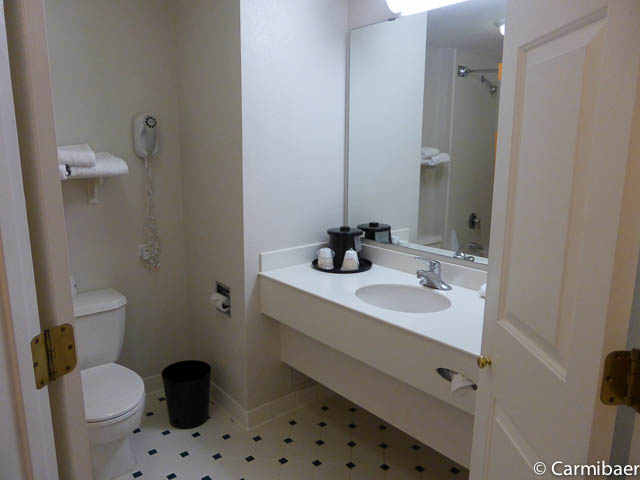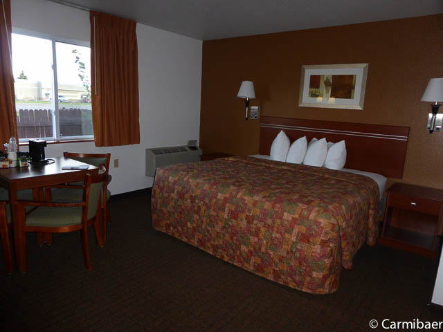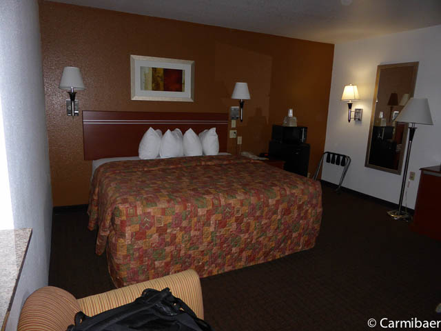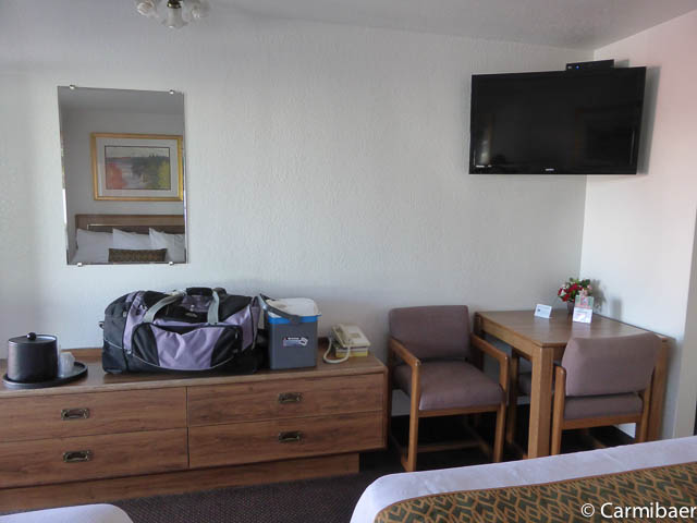 Das Motel ist schon etwas älter und renovierungsbedürftig in unseren Augen. Das Motel wird von vielen Bauarbeitern genutzt. Das Zimmer ist recht großzügig und ausgestattet mit Kühlschrank, Mikrowelle, Kaffeemaschine. Sauber war es, aber eben abgenutzt. Es gibt noch einen Tisch mit zwei Stühlen. Leider hat unser Zimmer eine Verbindungstür, allerdings hört man nicht wirklich etwas vom Nebenmann. Eher hört man draussen die Leute auf dem Gang laufen bzw. die Türen zuschlagen. Aber das ist ja üblich in vielen Motels, dass sie hellhörig sind. Es gibt einen Aufzug, allerdings endet dieser irgendwie meistens eine halbe Etage höher oder niedriger. Es gib drei Etagen und nur innenliegende Korridore. Es gibt einen Indoorpool und das WLan hat auch gut funktioniert.