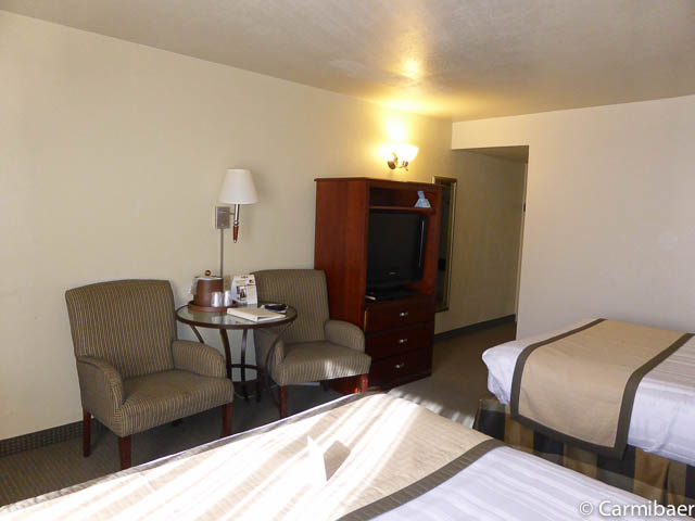 Von aussen wie von innen sieht es etwas renovierungsbedürftig aus, aber die Zimmer sind sauber. Es gibt einen kleinen Balkon, aber dies hatten nicht alle Zimmer. Es gibt wieder eine Mikrowelle, Kaffeemaschine und einen Kühlschrank im Zimmer. Bei uns war alles in einer kleinen Nische vor dem Bad untergebracht. Das Gebäude hat innenliegende Korridore und es hat zwei Etagen. Es wird wohl eher als Tagungs- und Seminarhotel genutzt, da es im Erdgeschoss mehrere grössere Räume gibt. WLan war vorhanden und auch in unserem Zimmer gut.
