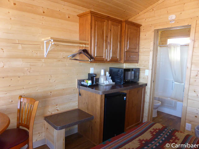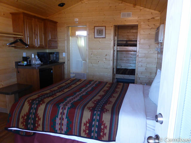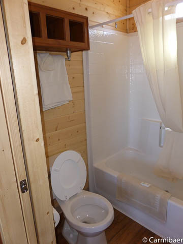 Die Cabins sind zweckmässig eingerichtet mit Mikrowelle, Kühlschrank, Kaffeemaschine. Es gibt auch noch eine zweite Kategorie an Cabins, diese haben noch einen Herd und sind etwas grösser. Uns hat die kleine Cabin ausgereicht. Das Queenbett ist etwas schmal für zwei bzw man muss kuscheln. Es gibt noch zwei Stockbetten, die auch schmal sind, aber für die Zwecke völlig ausreichend. Das Bad ist mit einer Wannendusche, Toilette, Waschbecken ausgestattet. Es gibt genügend Handtücher und einen Föhn.