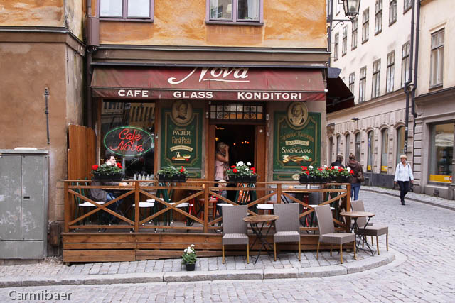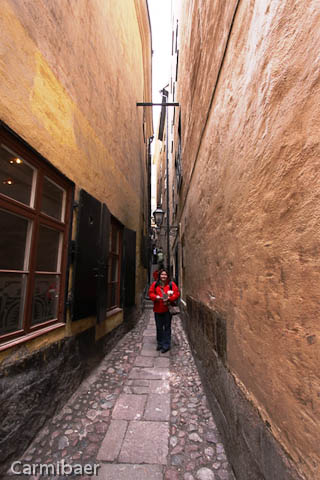 Die engste Gasse Stockholms ist die Marten Trotzigs Gränd. Sie ist nur 90 cm breit. Man vermutet überhaupt nicht eine Gasse zwischen den zwei Häusern. Wenn nicht soviele vor uns dort stehen geblieben wären hätten wir sie wahrscheinlich erstmal übersehen.