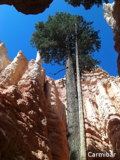 Wir mussten erstmal einen Parkplatz suchen, da es ziemlich voll war. Aber wir hatten Glück und es fuhr gerade jemand weg und da ist die Carmen doch glatt ganz schnell in die Parklücke gehuscht. Dann haben wir unser sieben Sachen zusammen gesucht und haben uns auf den Weg zum Navajo Trail gemacht. Wenn man sich mal die anderen Leute angeschaut hat, die da versucht haben diesen Trail zu laufen kamen meine Eltern gar nicht mehr aus dem Staunen raus. Manche hatten noch nichtmal einen Schluck Wasser dabei und andere sind mit ihren Sandaletten dort hinunter gelaufen.