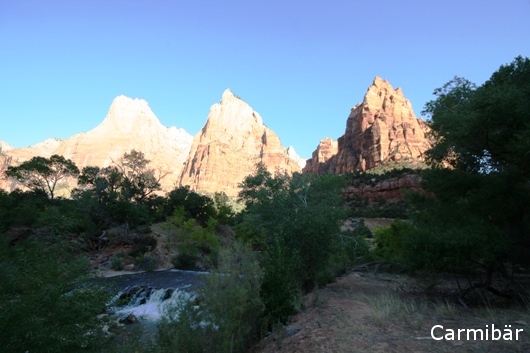 Die beiden sind mit dem Auto zum Visitor Center gefahren und dort in den Shuttle umgestiegen. Sie sind bei fast allen Viewpoints ausgestiegen, das erste mal beim Court of the Patriarchs Viewpoint. Dort sind sie ein wenig gelaufen, damit Knut ein paar schöne Fotos machen konnte.
