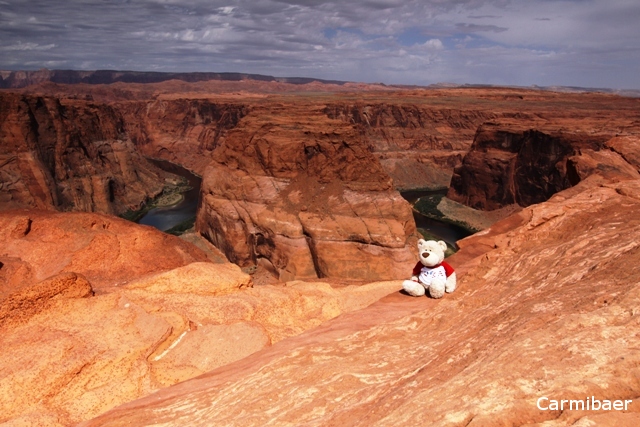 Dann haben wir geduscht, kurz im Forum vorbei geschaut, ein paar Bagels geschmiert und gegen 8.30 h sind wir aufgebrochen in Richtung Horseshoe Bend. Leider ist es heute Morgen bewölkt, aber dafür dann auch gleich nicht ganz so heiss. Um 8.45 h sind wir am Parkplatz (der gesperrt ist, weil er heute geteert wird) losgelaufen. Ich war auch ganz froh dort schnell wegzukommen, denn der Teer hat ganz schön gestunken. Der Anblick ist immer wieder total schön. Und dieses Mal durfte ich sogar auch mit und konnte mir das ganze in Natura mal anschauen. Das war so schön.