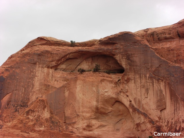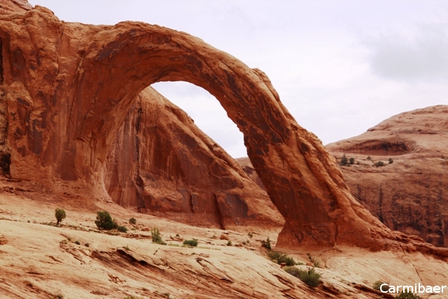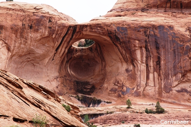 Die anderen haben sogar den Corona Arch zu Gesicht bekommen. Als sie die kleine Leiter erklommen waren, hat es leicht angefangen zu regnen. Sie haben von dort dann ein paar Bilder gemacht, denn der Blick war ja ganz schön zum Bowtie- und Corona Arch. Eigentlich wären sie gerne bis unter den Arch gelaufen, aber die immer schwärzer werdenden Wolken haben sie dann zum Rückweg gezwungen. Auch die anderen, die noch unter dem Arch eine Rast gemacht haben, sind glücklicherweise auch aufgebrochen. So konnten wir auch ein paar Bilder ohne Leute vom Arch machen.
