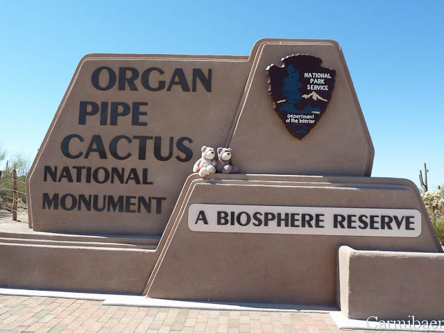 Gegen 11.00 h kamen wir dann am Eingangsschild des Organ Pipe N.M. vorbei. Wir sind ja fast in Ohnmacht gefallen als wir zum Foto Stop kurz aus dem Wagen geklettert sind. So heiß war es. Selbst ich wollte ganz schnell wieder ins klimatisierte Auto zurück. Mein Pelz war mir dann doch zu warm hier draußen.
