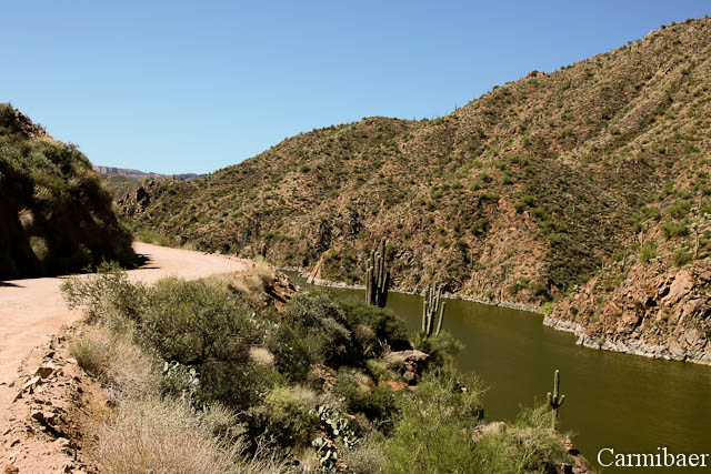 Um 7.15 h ging der Wecker. Wir wären gerne noch liegen geblieben, aber das ging ja nicht. Wir haben heute doch viel vor. Aber als erstes hat Carmen aber wieder mit ihren Eltern via Skype telefoniert um zu erfahren, was es alles Neues in der Heimat gibt und ihre Eltern wollten wissen, was wir alles schon gesehen haben und überhaupt. Dann wurde alles gepackt und der größte Teil gleich im Auto verstaut bevor es zum Frühstück ging. Der Raum war relativ groß und die beiden waren alleine dort, was aber auch kein Wunder ist, denn das Motel war nicht wirklich ausgebucht gewesen. Wir waren um 9.00 h die letzten, was uns aber nicht gestört hat. Generell sind die Motels wo wir bis jetzt waren ziemlich leer und wir hätten nicht reservieren müssen. Mal abwarten, ob es so bleibt. Um 9.30 h ging es dann los. Als erstes Richtung Roosevelt Lake und zur Roosevelt Bridge und Staudamm.