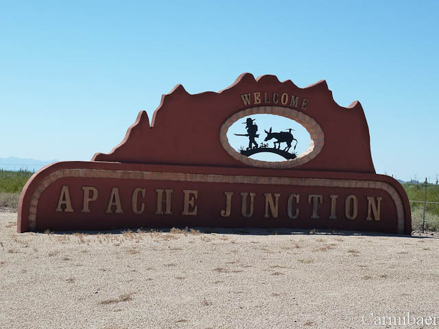 Danach ging es weiter auf der immer noch sehr kurvenreichen schmalen Strecke. Das Örtchen Goldfield ließen wir rechts liegen, denn wir wollten weiter. Obwohl es von der Ferne aus gesehen recht nett aussah. Aber alles können wir uns ja nicht anschauen. Wir brauchen ja etwas, um nochmals in diese Gegend zu fahren. Am schönen Apache Junction Schild wurde kurz angehalten um davon ein Bildchen zu machen.