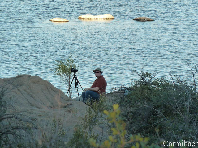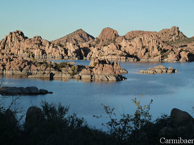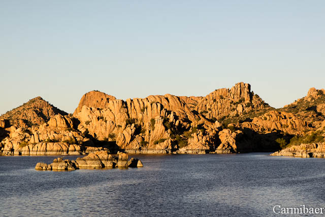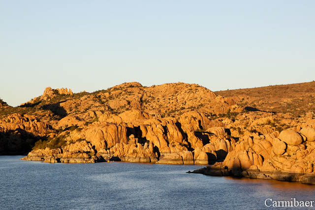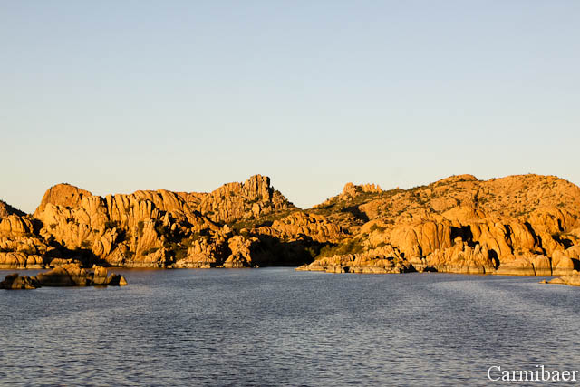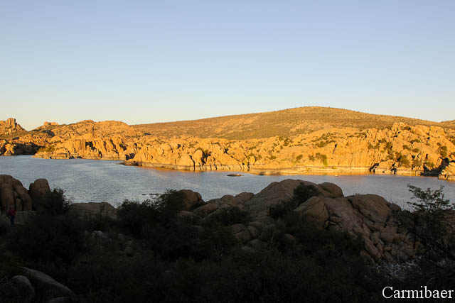 In Prescott angekommen sind wir nochmals zum Watson Lake gefahren. Wir wollten es nochmal versuchen dort ein paar Bilder zum Sonnenuntergang zu machen. Egal, ob dort ein Festival ist oder nicht. Und was soll ich sagen. Für 2 $ durften wir auf den Parkplatz fahren, um dann zum See zu gelangen. Wir durften parken wo wir wollten. Da hatten wir anscheinend mehr Glück als gestern Rainer. Der Weg war allerdings, trotz Trail, etwas eigenartig. Eigentlich sollte das ein Biketrail sein, Carmen weiß nur nicht, wie man dort wirklich mit dem Rad fahren soll. Es waren zum Teil sehr viele Steine dort und auch das Gestrüpp war sehr eng verzweigt. Knut hat sich bis runter zum See durchgeschlagen und hat von weiter unten ein paar schöne Bilder gemacht. Carmen hat sich das nicht so getraut und ist weiter oben geblieben und hat dort auch ein paar schöne Ausblicke genießen können. Ab und an hat man ein paar Klänge von dem Festival gehört, aber das hielt sich glücklicherweise in Grenzen.