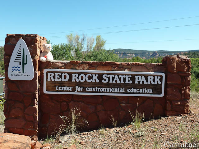 Dann ging es weiter auf dem Red Rock Loop gefahren und ein Stückchen von dem Loop ist tatsächlich unbefestigt. So sind wir demnach jeden Tag bis jetzt eine „Gravelroad“ gefahren. Mal abwarten wie viele es in den nächsten beiden Wochen noch werden. Kurz sind wir noch in den Red Rock State Park gefahren, wo wir allerdings nur am Visitor Center ausgestiegen sind und haben uns dort ein wenig umgeschaut. Im Park selber hätte man nur wandern müssen und bei der Hitze wollte das von uns keiner. Dafür haben wir aber das Eingangsschild auf dem Rückweg noch abgelichtet.