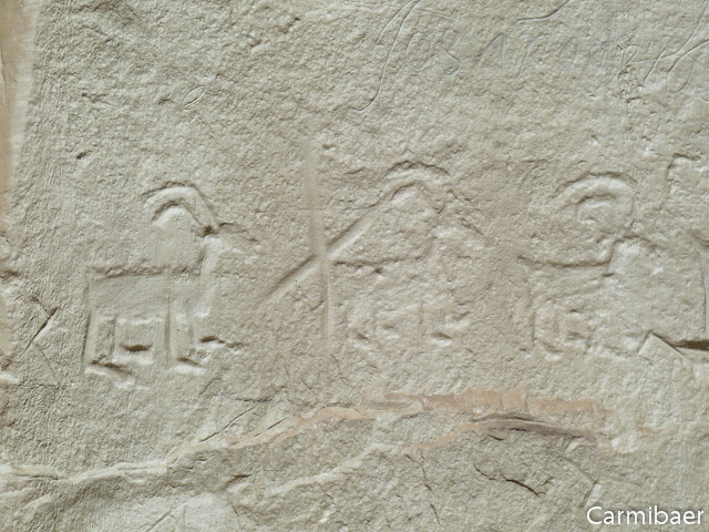 Der Ranger bzw. Volunteer war echt nett. Er hat mit uns geplaudert und dann hat er noch gemeint, als Knut mich für den kurzen Trail ins Auto packen wollte, dass ich Bärchen doch mit soll. Gesagt - getan. Ich durfte mit. Das war was. Es war, trotz der Höhe von über 2000 m, recht warm. Die Sonne brannte. Aber auch kein Wunder, wir waren ja um kurz vor 13 h erst dort und sind nach einer Stunde wieder gefahren. Der Trail war ganz nett und die diversen Inschriften im Felsen war auf einem schönen Tableau gut erklärt.