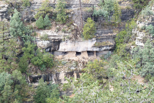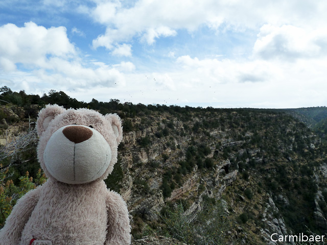 Danach geht es um ca. 10.00 h zum Walnut Canyon. Im Moment regnet es mal nicht. Aber es sind immer noch dunkle Wolken am Himmel, obwohl zwischendurch auch mal die Sonne hervorblitzt. Kurze Zeit später sind wir am Eingangsschild angekommen und wir haben Glück. Die Steine sind abgetrocknet und so können wir uns in Pose setzen. ![]()
