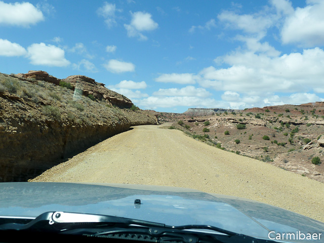 Danach ging es über die Temple Mountain Road in Richtung I 70. Wir wollen es zumindest probieren, denn die Rangerin war sich nicht sicher, ob man sie fahren könnte. Sie meinte, wenn, wäre am Anfang der Wash wohl etwas schwierig, der Rest geht, wie ihr jemand gesagt hat. Es hat hier auch in den letzten Tagen geregnet. Aber heute ist ja herrliches Wetter. Es lacht die Sonne vom Himmel und es gibt Schäfchenwolken.