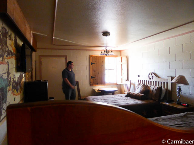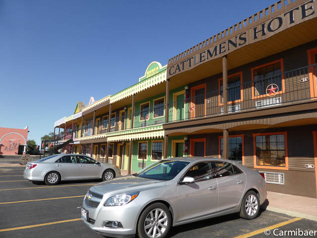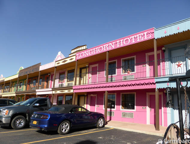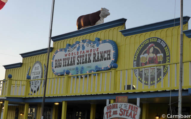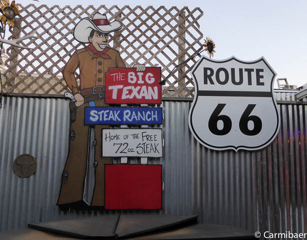 Die restlichen ca. 40 Meilen bis Amarillo haben wir dann auch schnell geschafft und das Big Texan Motel haben wir auch schnell gefunden. Kurz eingecheckt, Bilder vom Zimmer gemacht und gleich mal wieder an die Rezeption und ein neues Zimmer verlangt, weil mal wieder ein Bettlaken beschmutzt war. Wohl war es frisch gewaschen und die Flecken werden nicht rausgehen, aber eklig ist sowas ja schon. Das nächste Zimmer sieht etwas anders aus bzw. die Amaturen im Bad sind schon sehr fragwürdig, aber es funktioniert alles und die Betten sind auch sauber.