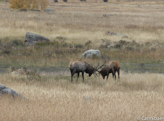 Jetzt haben wir die Rückfahrt angetreten. Und kaum wieder am Morraine Visitorcenter angekommen haben wir nochmals länger angehalten, denn jetzt war der Elkbulle auch mit von der Partie. Und ein Stückchen weiter haben sich zwei Bullen in den Haaren gehabt.