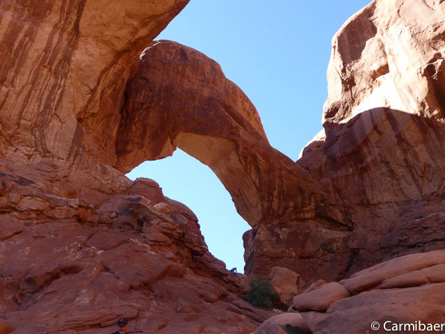 Kaum am Auto angekommen sind wir zur Windows Section aufgebrochen. Dort hatten wir Glück mit einem Parkplatz, was in Anbetracht der hier sogar verkehrenden Reisebusse gar nicht so einfach ist. Die kurze Wanderung oder vielmehr der kurze Spaziergang zum Double Arch ist auch schnell vollbracht, nur die Fotos nicht, da gerade eine japanische oder chinesische Reisegruppe dort rumturnt.
