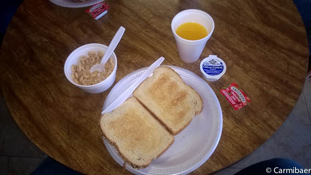 Das Frühstück fällt heute echt spärlich aus. Denn es gibt gerade mal einen Toast und Müsli für Knut und Carmen hat nur einen Toast mit Butter gegessen und dazu gab es noch O-Saft. Viel mehr gab es auch nicht im spärlichen Office. Die beiden sind auch ganz alleine dort gewesen.