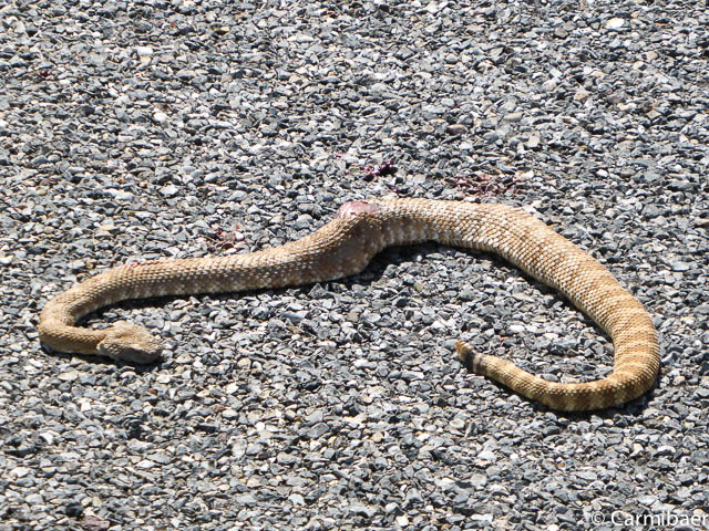 Und eine Klapperschlange haben wir auch auf der Strasse gesehen. Unsere erste. Leider war sie überfahren, wie wir dann festgestellt haben. Also nicht so genau hinschauen bitte. Denke, sie hat wohl gerade was verspeist oder es war der Reifen, der sie erwischt hat, dass sie an der einen Stelle so dick aussieht.