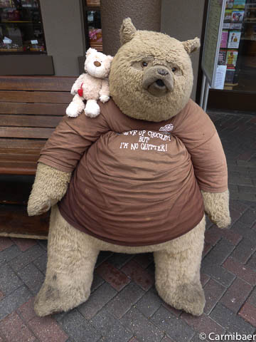 Wir gehen auch noch einmal Richtung Innenstadt bzw. Einkaufsstraße. Es gibt ein paar nette Geschäfte. Die meisten sind Sportgeschäfte. Und einen pelzigen Freund haben wir hier auch gefunden. Kenne ja solche großen Bären schon. Gibt es irgendwie an ein paar Standorten. ![]()