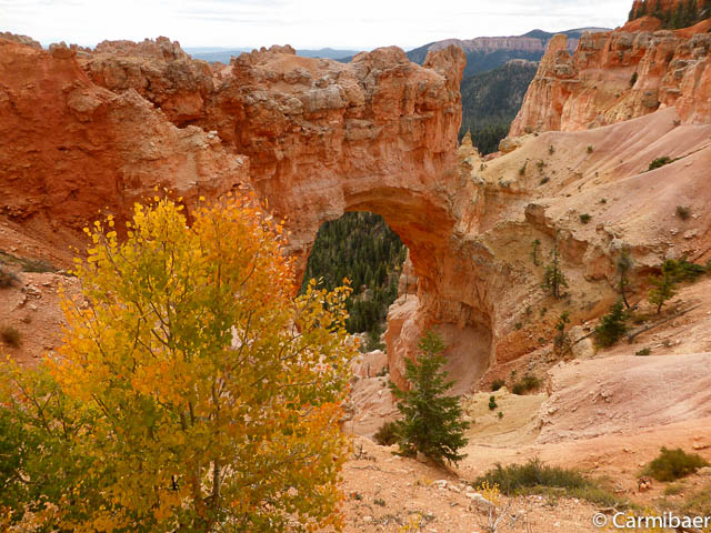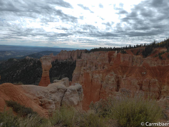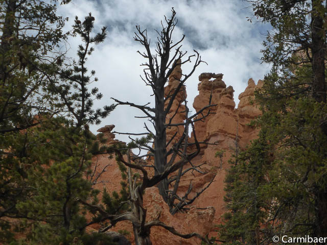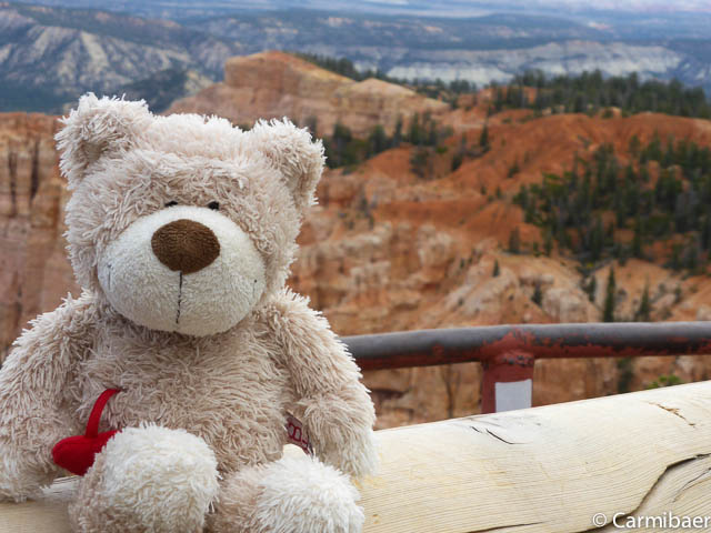 Carmen läuft um 11:50 h den Navajo/Queens Garden Trail mit dem Glücksbären alleine. Knut hat seit heute morgen Kopfschmerzen und bleibt oben am Rim. Wir haben ja bis zum Rangertalk noch jede Menge Zeit und wirklich weg von hier wollen wir nicht, wenn wir schon einmal einen super tollen Parkplatz in so kurzer Zeit ergattert haben. ![]()