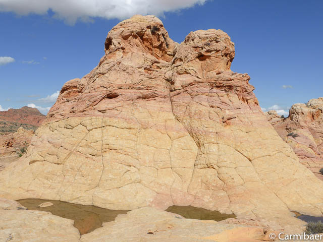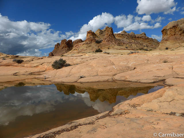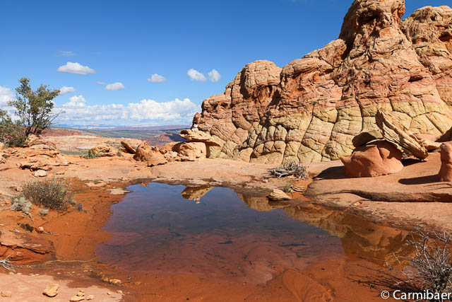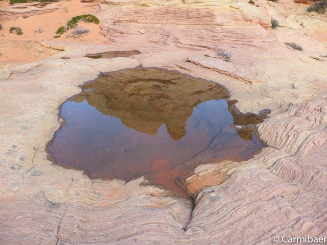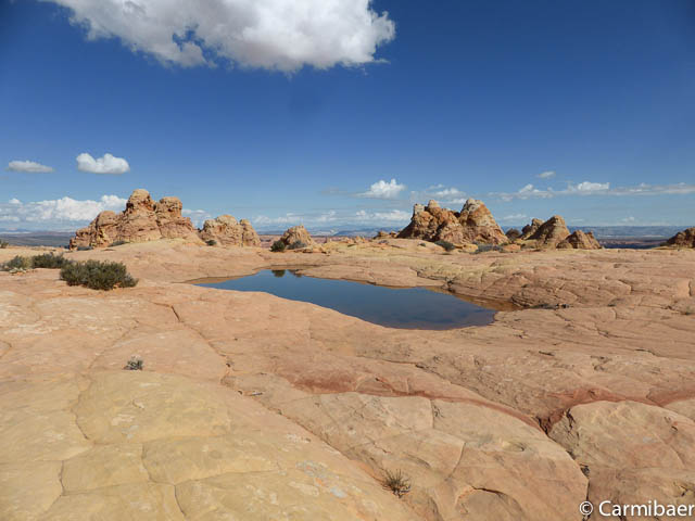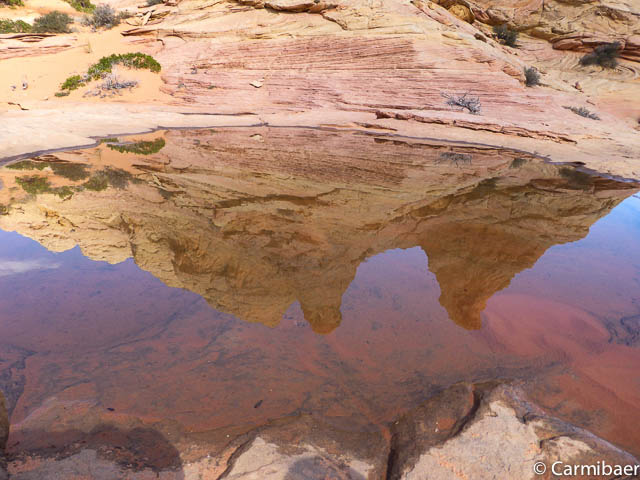 Es ist hier echt genial. Schon alleine, dass wir Glück haben, dass hier zum Teil Wasser in Löchern steht und die Buttes und der Himmel sich so schön spiegeln.