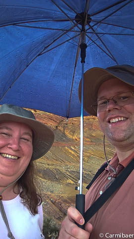 Kurz drauf schüttet es. Wir haben zwei Schirme dabei. Diese waren als Sonnenschutz gedacht. Jetzt werden sie eben als Regenschutz genommen. Der Glücksbär verschwindet dann mal schnell im Rucksack, denn er ist schon so nass wie Carmen. Aber zum Glück sieht man es nicht so, dass Carmens T-Shirt schon ganz nass ist. Denn der Schutt kam so plötzlich, dass das flüchten unter Knuts Schirm nix genutzt hat.