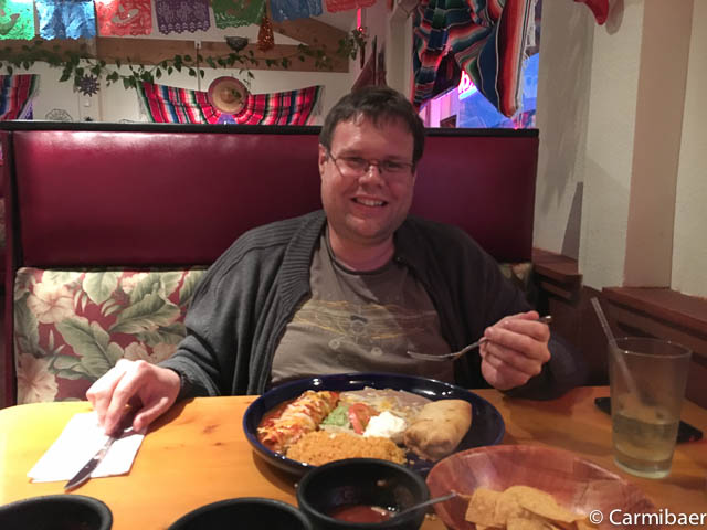Um 18:30 h gehen die beiden essen. Es geht zum Mexikaner, wie letztes Jahr. Das Essen ist wie immer gut. Es gibt Fajitas für Carmen und Knut hat Chimichanga und Burrito gegessen.
