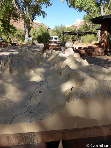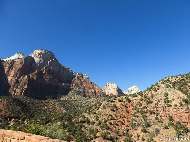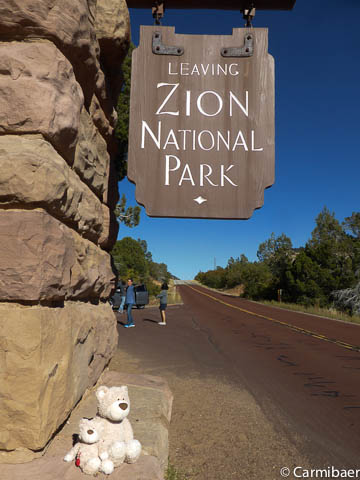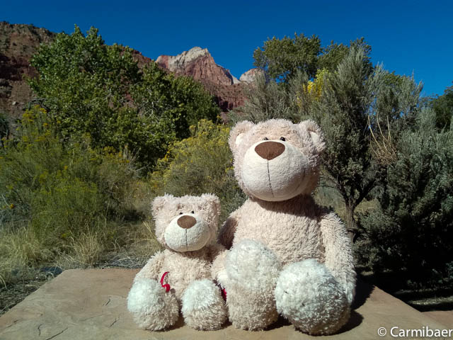 Unterwegs kurz vorm Zion kommen wir wieder an der schönen Bank vorbei. An diese Bank konnte ich mich von 2009 noch erinnern und habe gehofft, dass ich diese wiederfinde. Und es war gar nicht schwierig. Ich meine sogar, dass sie seit dem einen neuen Anstrich erhalten hat. Ich finde es klasse, dass es diese noch gibt und so halten wir an und wir bekommen das erste gemeinsame Bild auf dieser Reise. Beim Aussteigen hat Carmen fast den kleinen Wassergraben übersehen, aber im letzten Moment ist sie noch drübergesprungen und wir sind alle nicht nass geworden. Was für ein Schreck, nur wegen der Bank.