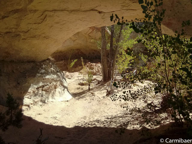 Dort gehen wir rein und schauen uns um. Ist echt nett hier und wir sind total alleine. Aber es ist im Schatten doch noch recht frisch und durch die Felswände nicht wirklich warm. Auch kommt hier nicht überall Sonne hin bis zum Boden, aber wo, da bleiben die drei kurz stehen und wärmen sich auf.
