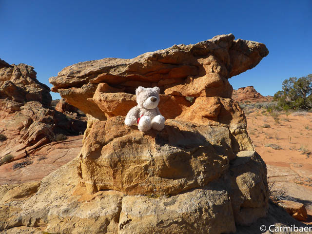 Hier müssen wir noch die Formalitäten erledigen und jeder muss einen Zettel ausfüllen. Als Susan mich entdeckt fällt ihr ein, das wir schon mal hier gewesen sind und mit ihnen unterwegs gewesen sind. So haben wir noch einen Rabatt für heute bekommen. Das freut uns echt riesig. Wir können die Paria Outpost nur weiter empfehlen. Beim nächsten Mal würden wir wieder mit ihnen in das Gebiet fahren. Denn so hat man keinen Stress und braucht sich um nix Gedanken zu machen, wenn man stecken bleibt. Dann wird einem schon geholfen. Wir wurden auch von Susan gefragt, was sie uns auf unsere Brote machen soll. Denn Sandwich und Getränke sind im Preis mit drin. Und Getränke braucht man dort schon einige. Wir frühstücken noch ein paar süße Teilchen und hier begrüsse ich mal einen Bären. Carmen musste unbedingt auch mit aufs Bild, dabei wollte sie nicht, aber ein netter Herr hat nicht locker gelassen, bis sie sich neben mich gekniet hat.